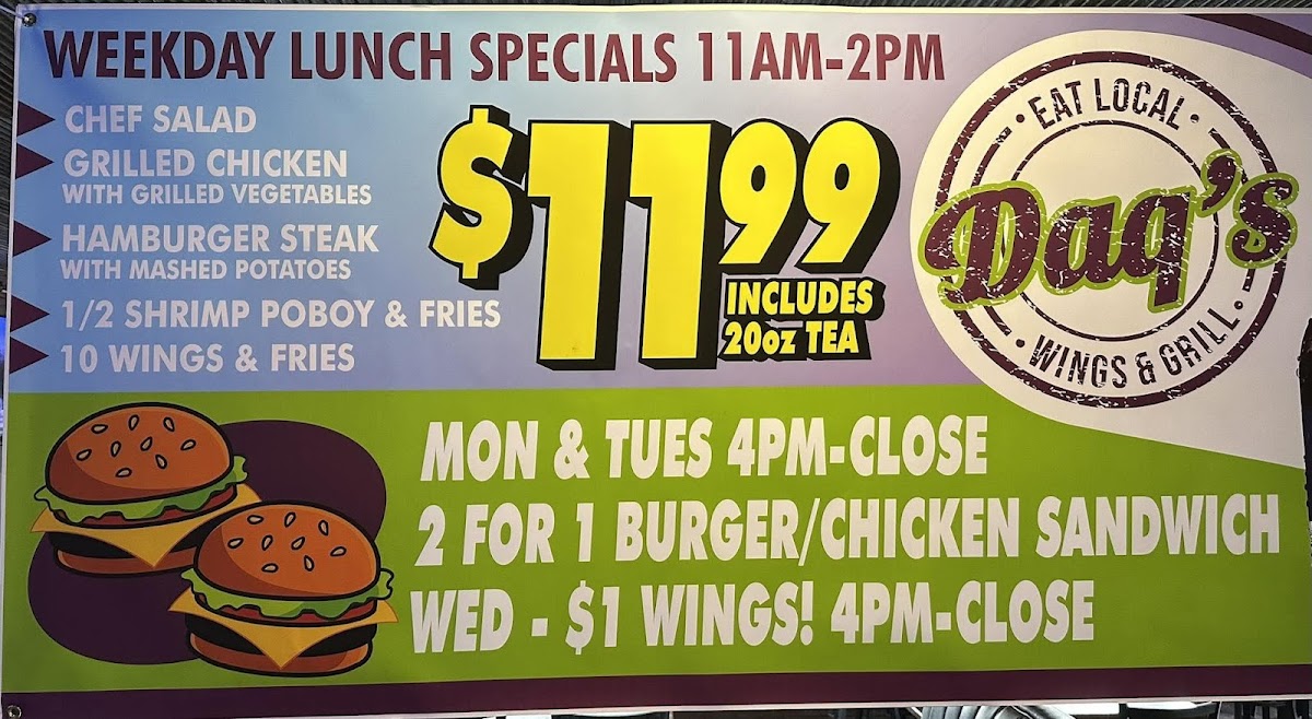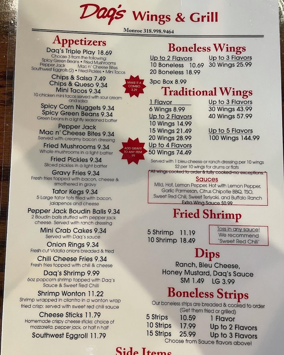 From a reviewer’s perspective, the menu at Daq's Wings & Grill at 2217 Forsythe Ave, Monroe, LA 71201, United States, feels like a well-rounded reflection of a classic American grill that knows its audience and delivers variety without overcomplicating things. Overall, the menu comes together as a satisfying mix of comfort food, crowd favorites, and flexible portion options that make it suitable for both quick meals and group dining.