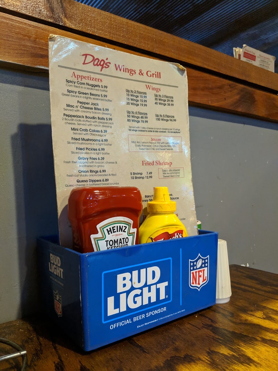 Families are clearly considered with a dedicated Kids’ Meal section featuring Grilled Cheese, Cheeseburger, Hamburger, Corn Dog, and 2 Plain Strips. Finally, beverages like Sweet Tea, Diet Coke, Barq's, Powerade, and Bottled Water, paired with dips such as Ranch, Honey Mustard, Blue Cheese, and Daq's Sauce, round out the experience nicely. As a whole, the menu feels cohesive, generous, and satisfying-exactly what you’d expect from a neighborhood grill done right.